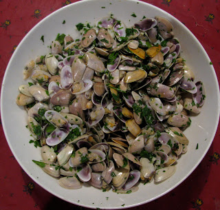 The first guests arrive around 8 and the last around 9; this is the apero hour when the guests chat and mingle with a drink, usually a Kir, a Ricard or a glass of wine. They help themselves to various hors d’oeuvres, usually toasts with tapenade (olive paste) and parmasan, or home-made pate. Last week I served a bowl of Tellines, which I had bought in the market, they are tiny clams, raked up in the shallows of the nearby Camargue beaches and are sweet and succulent. You cook them for one minute, or until their shells open up and then dress them with olive oil, garlic and parsley. Unfortunately, one of the shells fell on the floor and our dog, Ralph, pounced on it, feigning starvation as he does, and one of the guests, Anna, tried to take it off him, fearing he might choke. I was in the kitchen at the time and I heard an angry bark and then Anna came in holding her bloody hand. Luckily she admitted it was her own fault. (The Artist thinks the dogs should be locked up, or made to stay in the courtyard, but they give so much entertainment value it seems a shame to me).